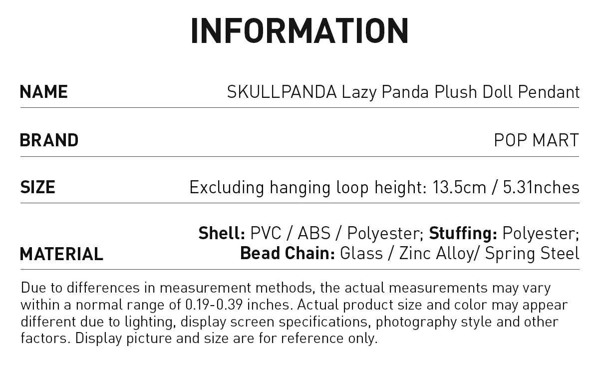 Møt Pop Mart SKULLPANDA Lazy Panda Plush Doll Pendant! Med en høyde på 13,5 cm er dette den perfekte kombinasjonen av mykhet og stil. Bruk den som bag-charm, samleobjekt eller en søt gave til en ekte Pop Mart-fan. Rolig, søt – og alltid klar til å bli med deg på farten!