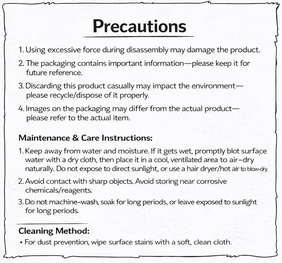 Keep away from water and moisture. If it gets wet, promptly blot surface water with a dry cloth, then place it in a cool, ventilated area to air-dry naturally. Do not expose to direct sunlight or use a hair dryer/hot air to blow-dry.