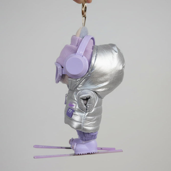 Antrekket består av: varm boblejakke med hette, lilla lue, shorts, ski med matchende støvler, samt vinter-tilbehør som skibriller og øreklokker/headset – et lekent “ski day”-uttrykk som skiller seg ut i samlingen!